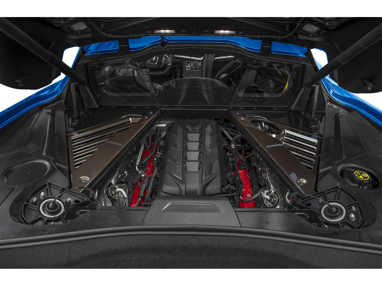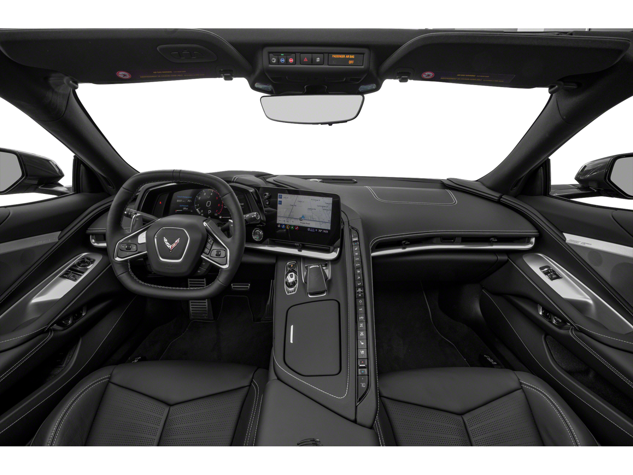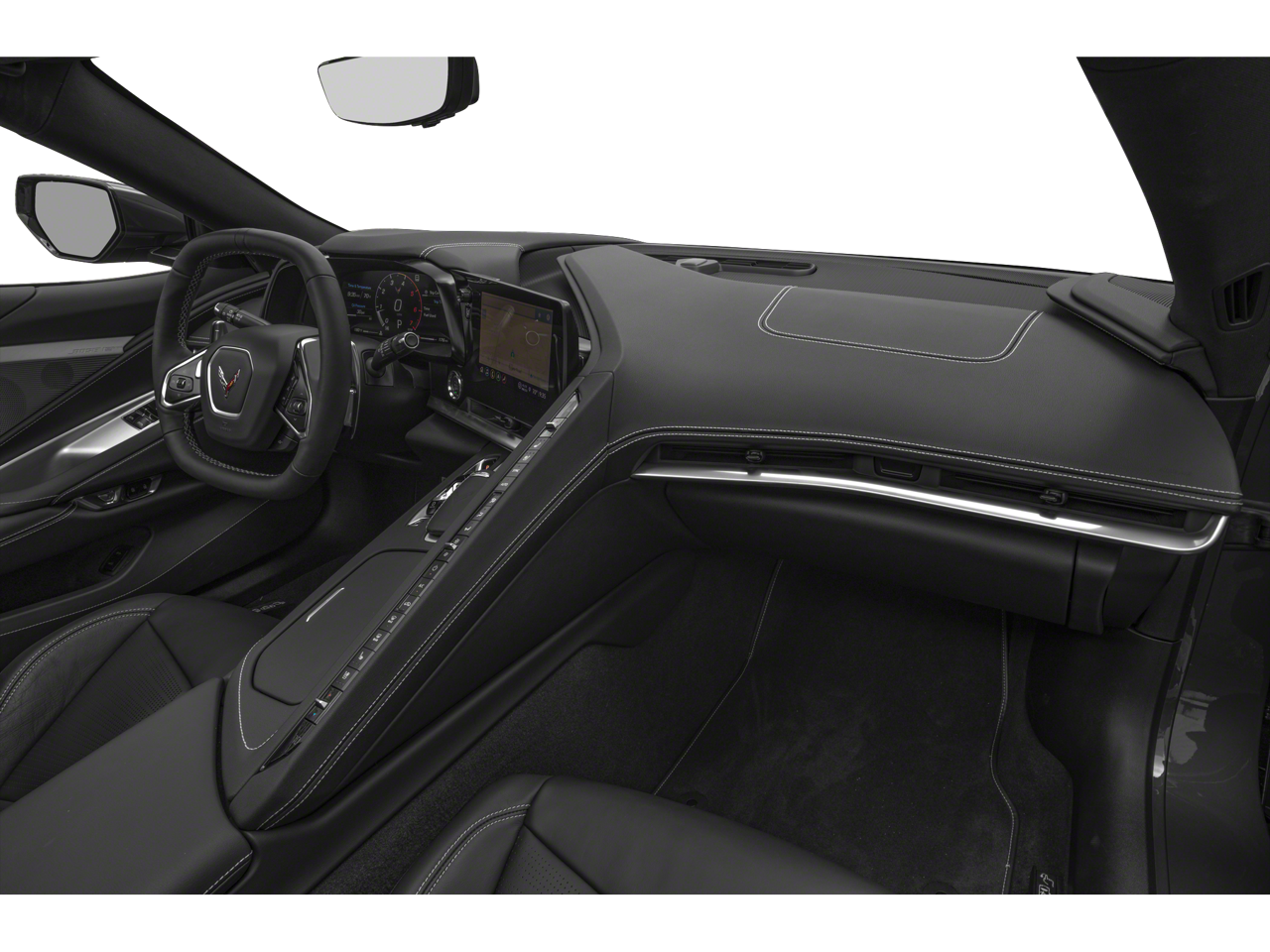 LPO, 19 X 8.5 (48.3 CM X 21.6 CM) FRONT AND 20 X 11 (50.8 CM X 25.4 CM) REAR 5-TRIDENT-SPOKE BLACK-PAINTED ALUMINUM WHEELS includes (SPY) Black lug nuts, LPO, (SPZ) Black wheel locks, LPO, and (SD5) Tire pressure monitor, LPO. Genuine Corvette Accessory, SEATS, GT2 BUCKET, AUDIO SYSTEM, CHEVROLET INFOTAINMENT 3 PREMIUM SYSTEM WITH CONNECTED NAVIGATION 8 diagonal HD color touchscreen, AM/FM stereo, Bluetooth® audio streaming for 2 active devices, Apple CarPlay® and Android Auto® capable, enhanced voice recognition, additional memory for in-vehicle apps, cloud connected personalization for select infotainment and vehicle settings. (STD), ENGINE, 6.2L V8 DI, HIGH-OUTPUT Variable Valve Timing (VVT), Active Fuel Management (AFM) (490 hp [365.4 kW] @ 6450 rpm, 465 lb-ft of torque [627.8 N-m] @ 5150 rpm) (STD), TRANSMISSION, 8-SPEED DUAL CLUTCH, INCLUDES MANUAL AND AUTO MODES (STD).