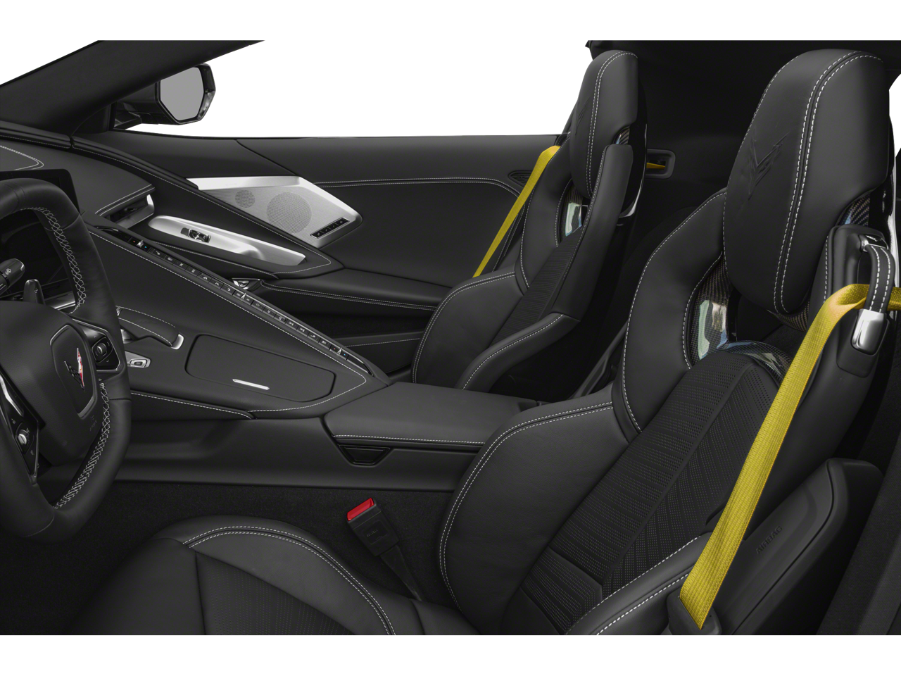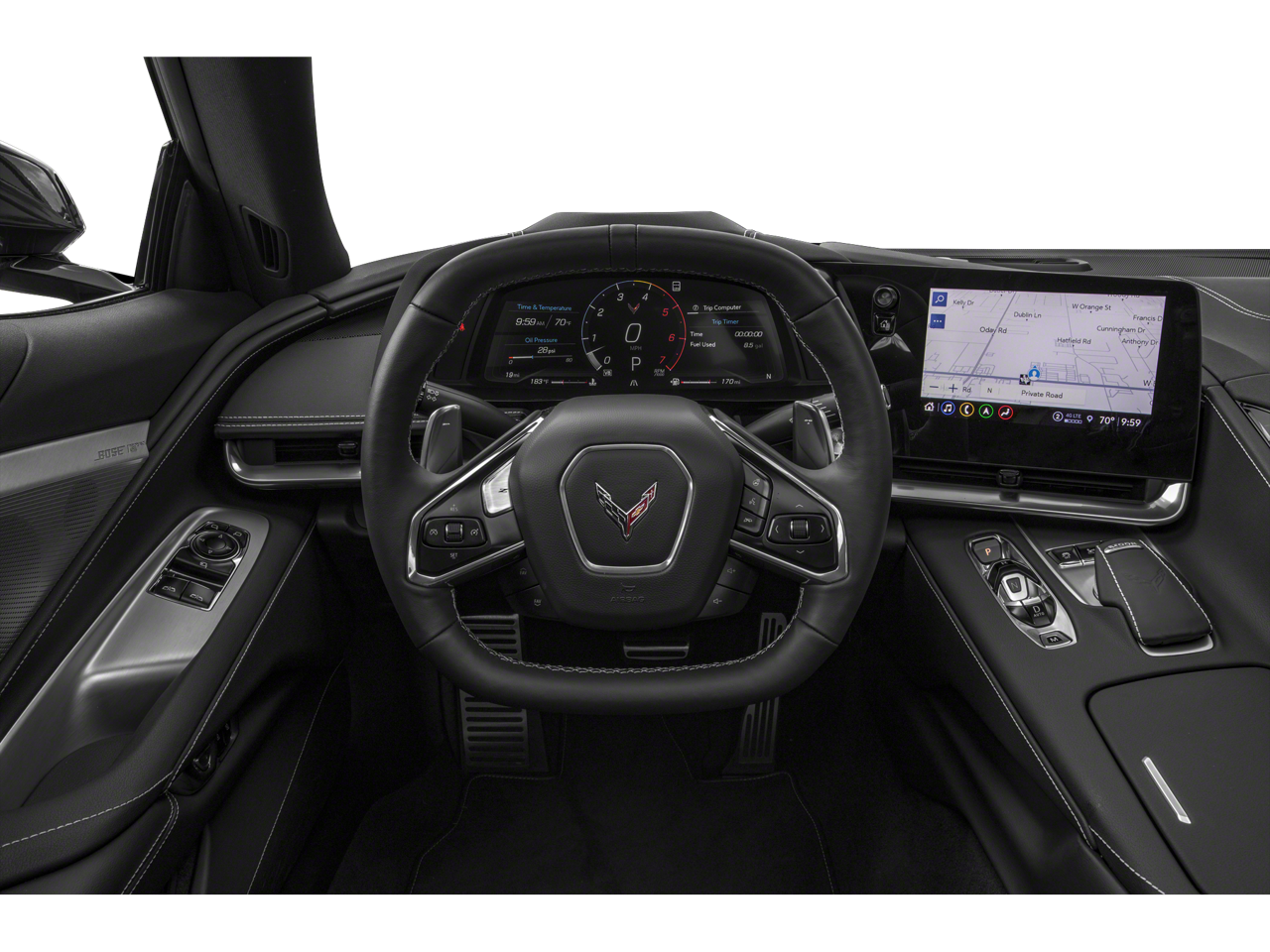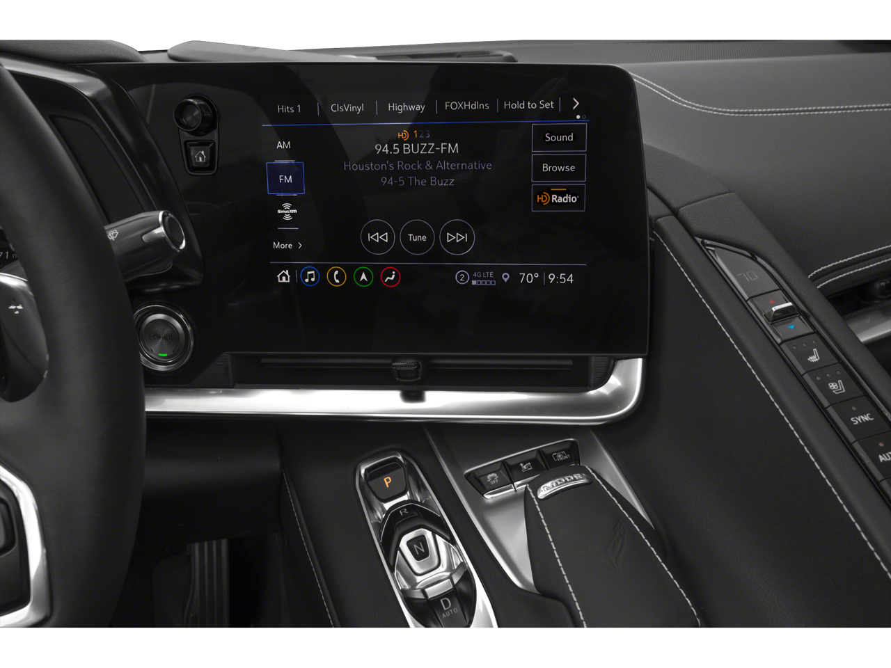 LPO, 19 X 8.5 (48.3 CM X 21.6 CM) FRONT AND 20 X 11 (50.8 CM X 25.4 CM) REAR 5-TRIDENT-SPOKE BLACK-PAINTED ALUMINUM WHEELS includes (SPY) Black lug nuts, LPO, (SPZ) Black wheel locks, LPO, and (SD5) Tire pressure monitor, LPO. Genuine Corvette Accessory, SEATS, GT2 BUCKET, AUDIO SYSTEM, CHEVROLET INFOTAINMENT 3 PREMIUM SYSTEM WITH CONNECTED NAVIGATION 8 diagonal HD color touchscreen, AM/FM stereo, Bluetooth® audio streaming for 2 active devices, Apple CarPlay® and Android Auto® capable, enhanced voice recognition, additional memory for in-vehicle apps, cloud connected personalization for select infotainment and vehicle settings. (STD), ENGINE, 6.2L V8 DI, HIGH-OUTPUT Variable Valve Timing (VVT), Active Fuel Management (AFM) (490 hp [365.4 kW] @ 6450 rpm, 465 lb-ft of torque [627.8 N-m] @ 5150 rpm) (STD), TRANSMISSION, 8-SPEED DUAL CLUTCH, INCLUDES MANUAL AND AUTO MODES (STD).